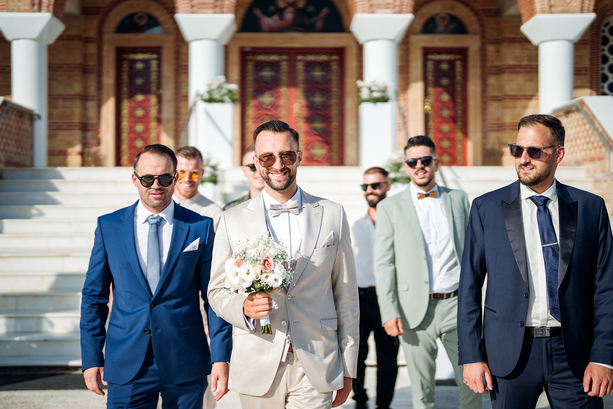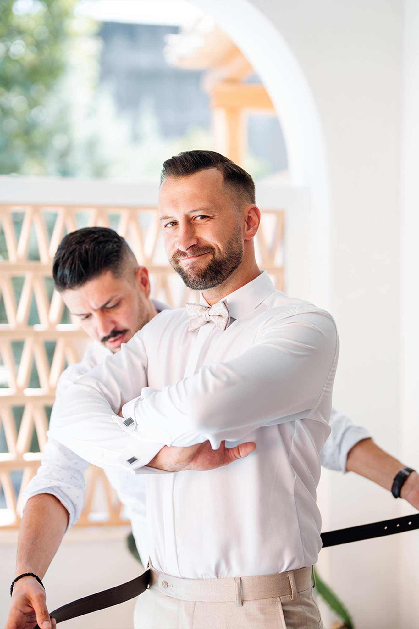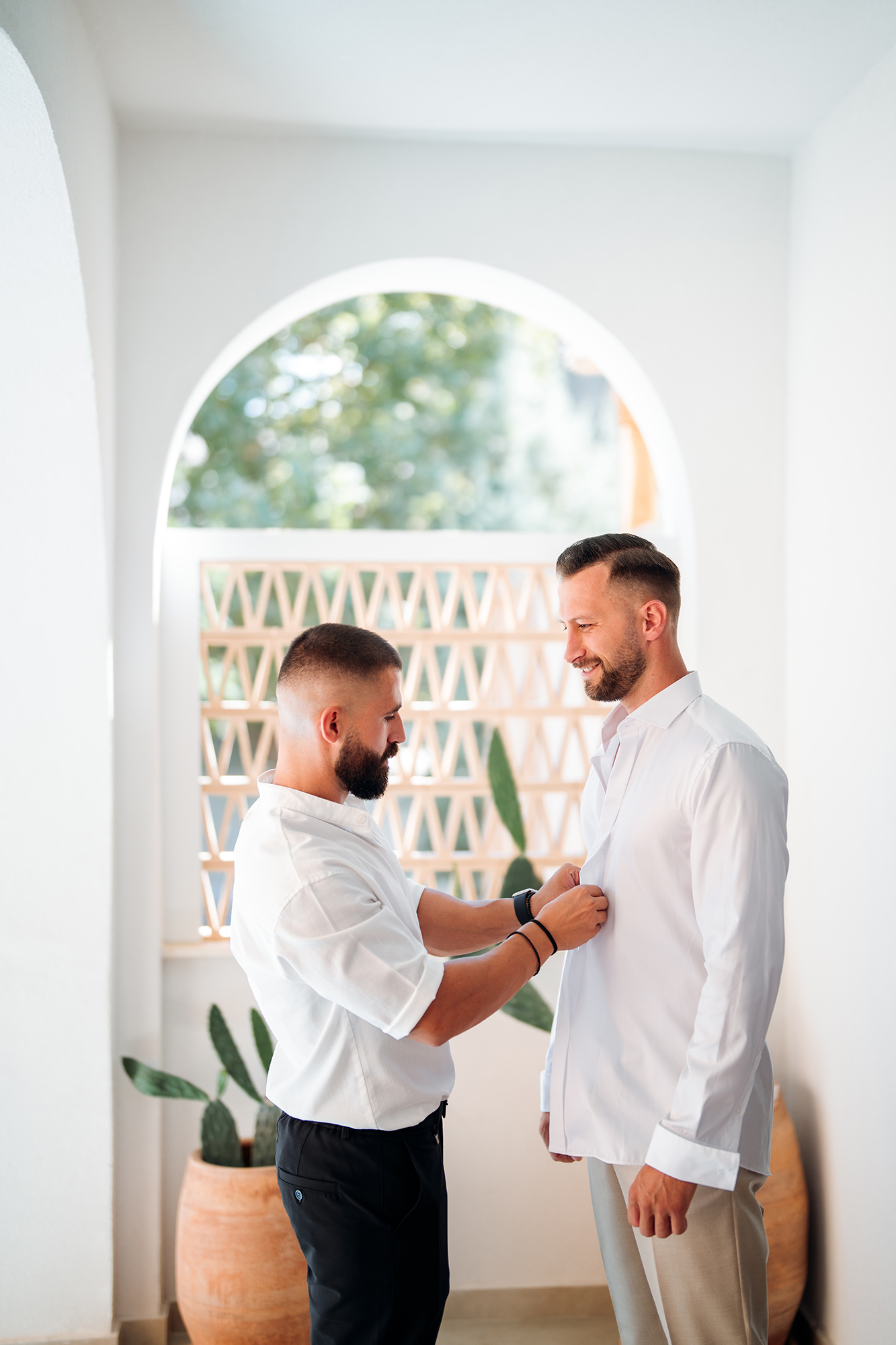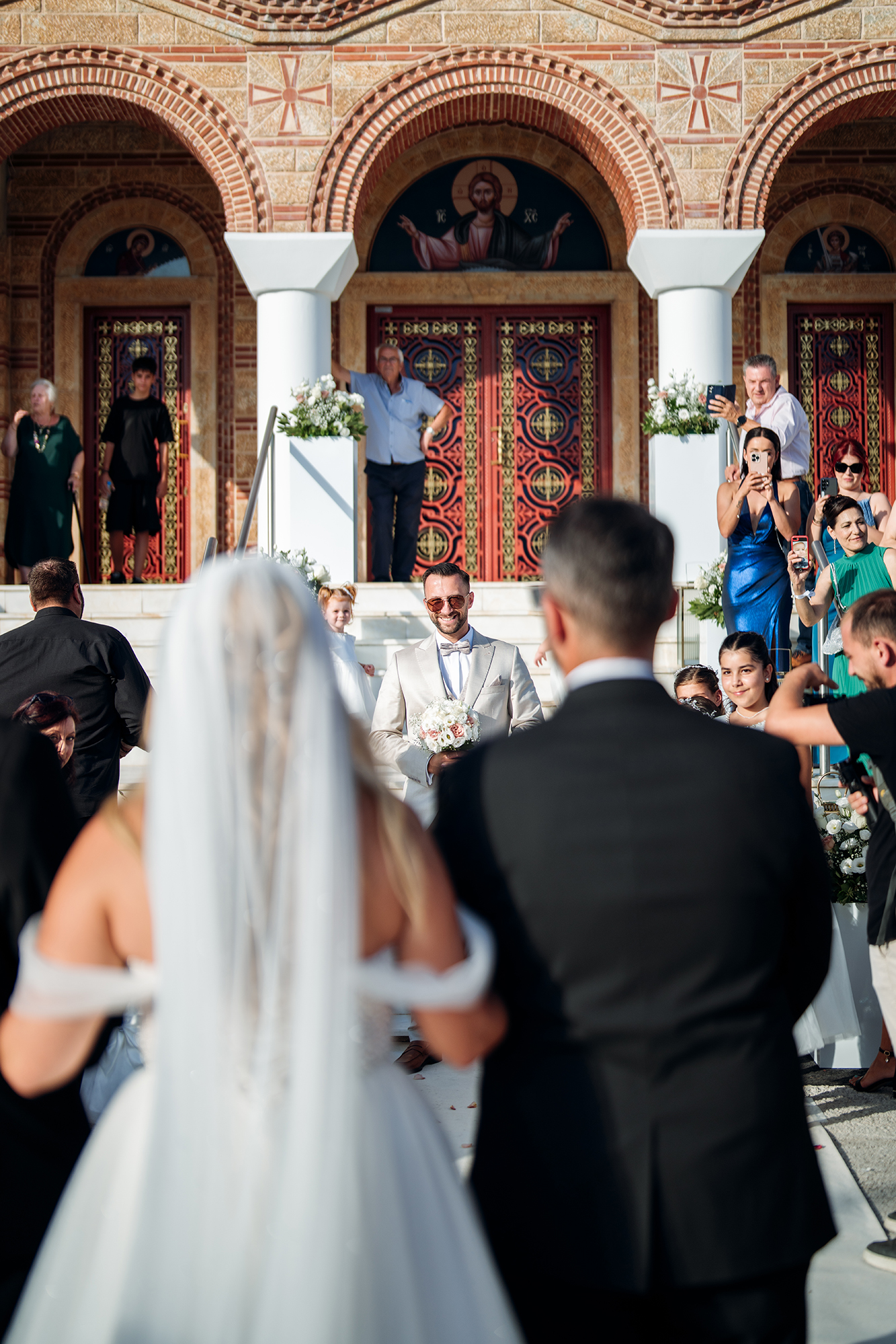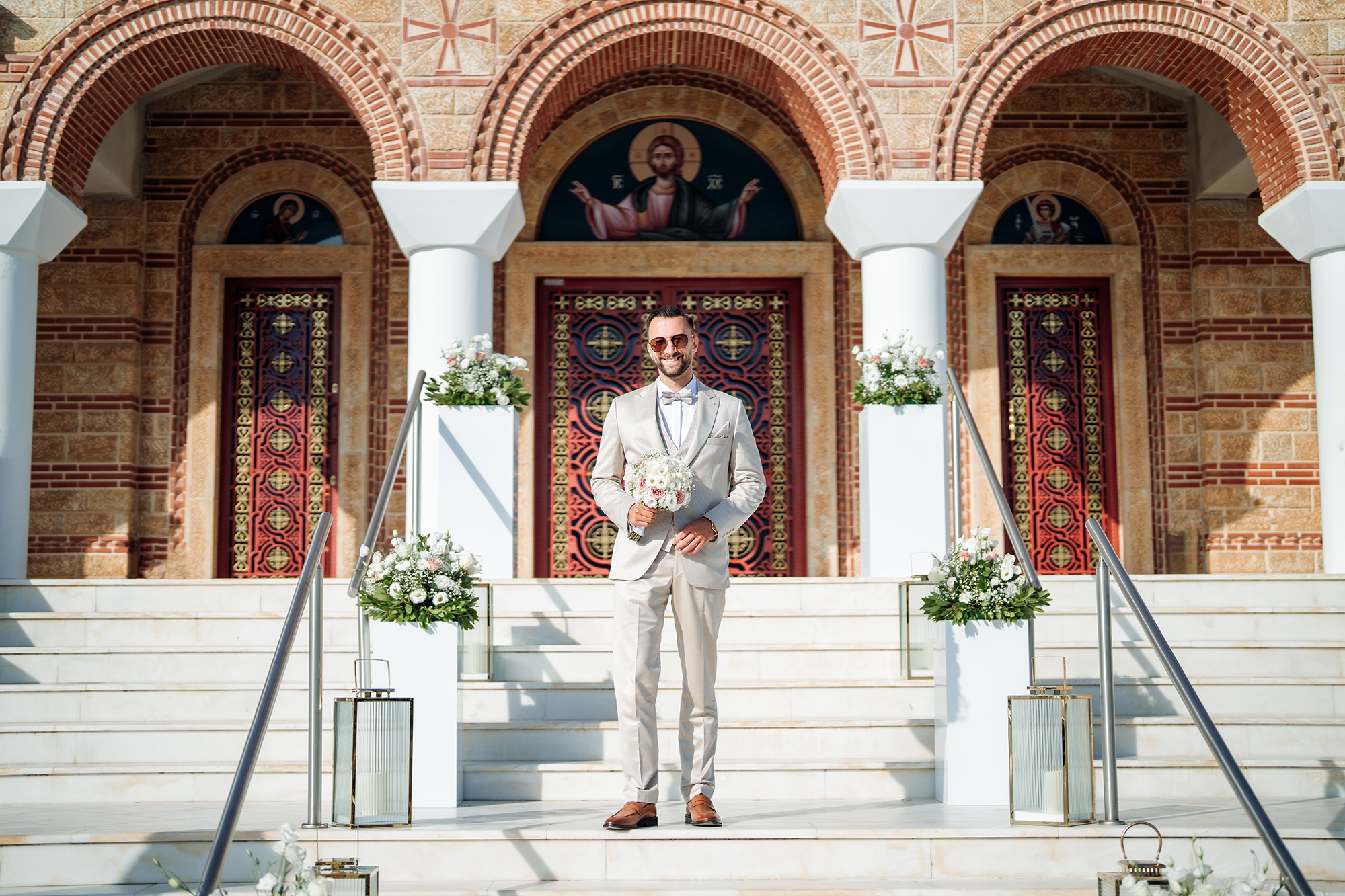 Yiannis listened to us and got dressed at a beautiful hotel. Nicole got ready at her parents’ house and walked to the church next door.