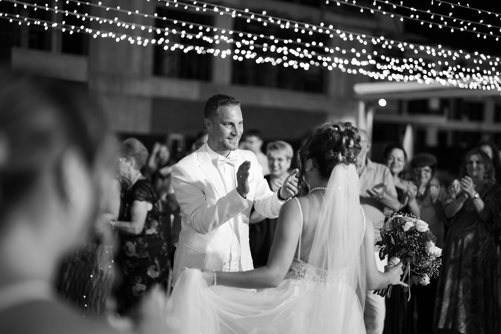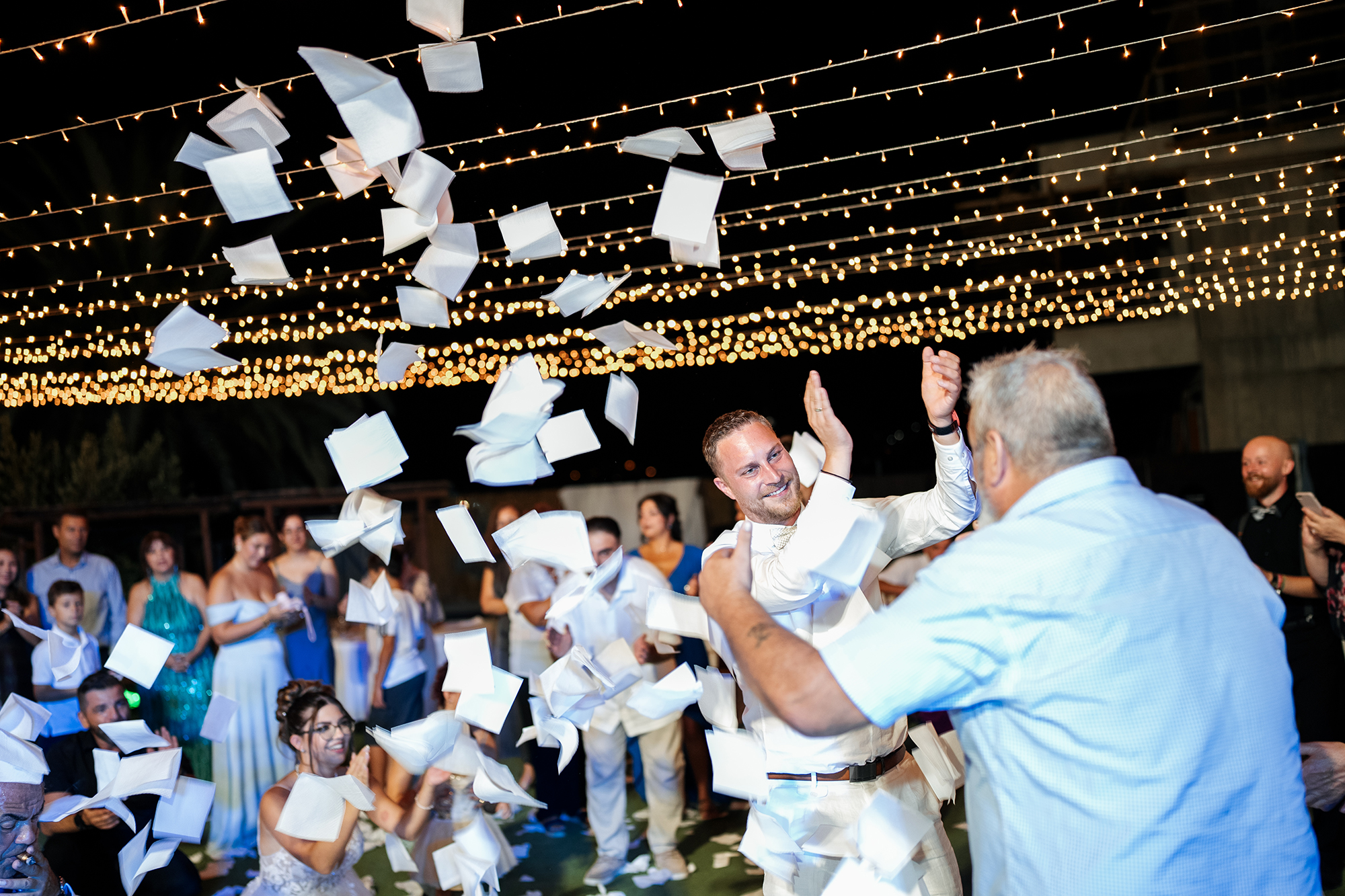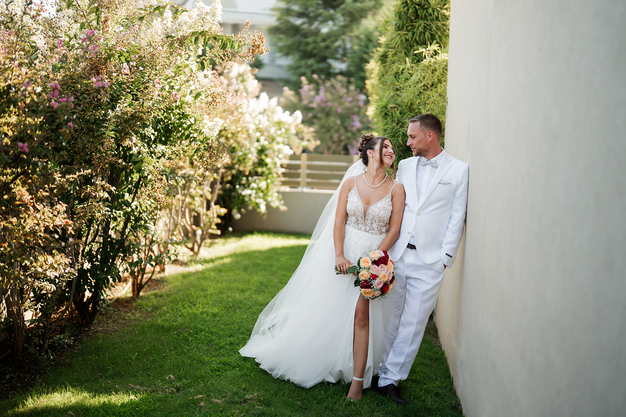 The first look took place in the groom’s preparation area, which isn’t common in traditional Greek weddings. This wedding blended Greek and German culture.