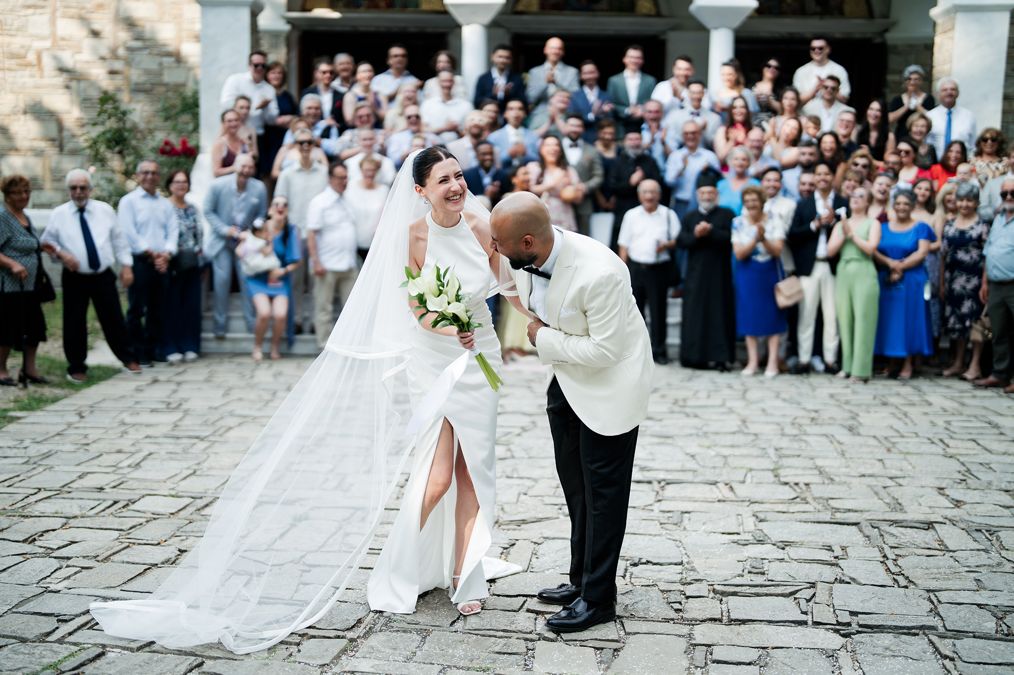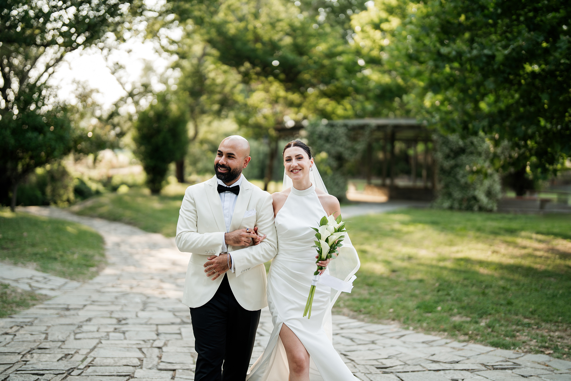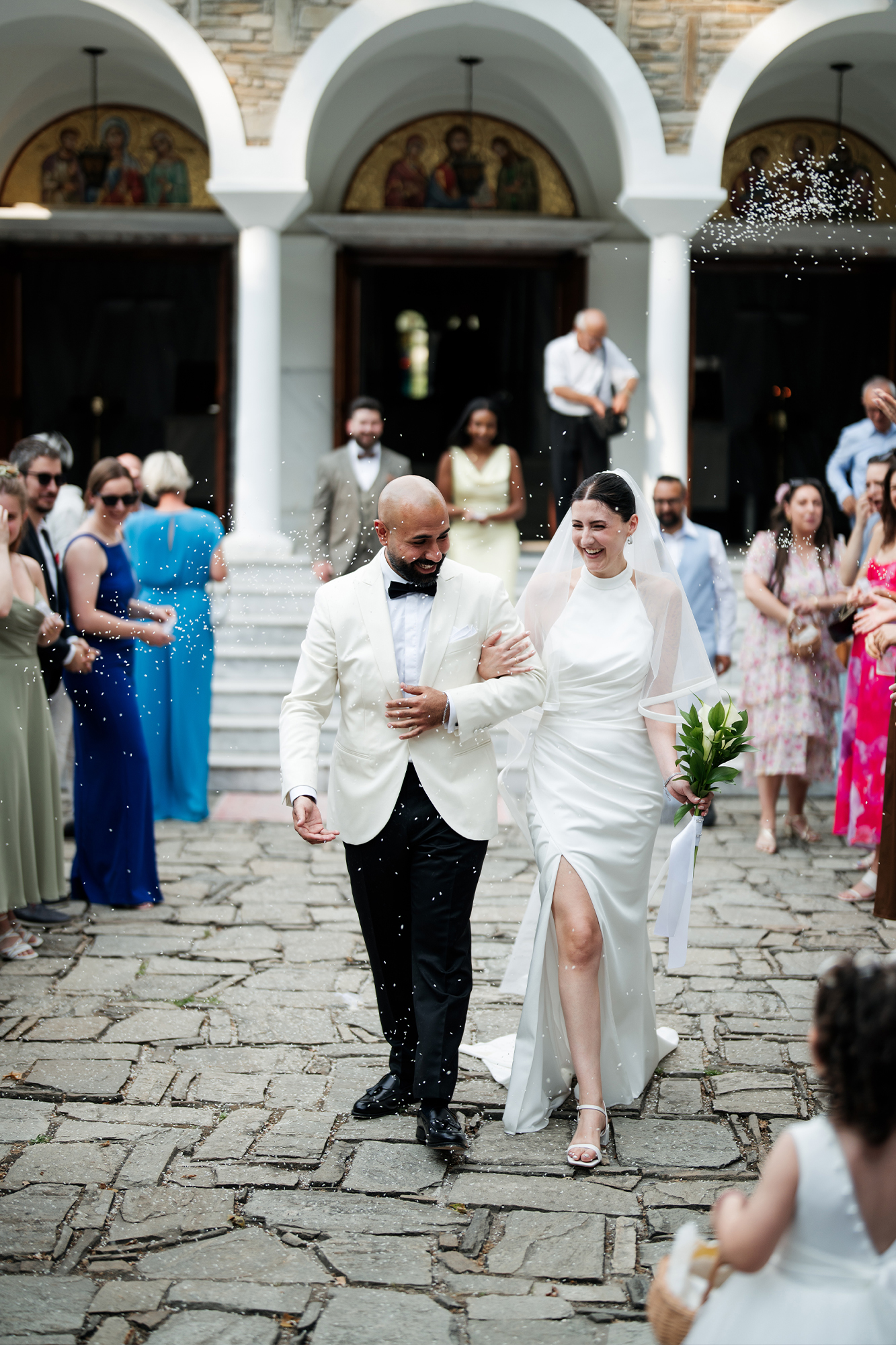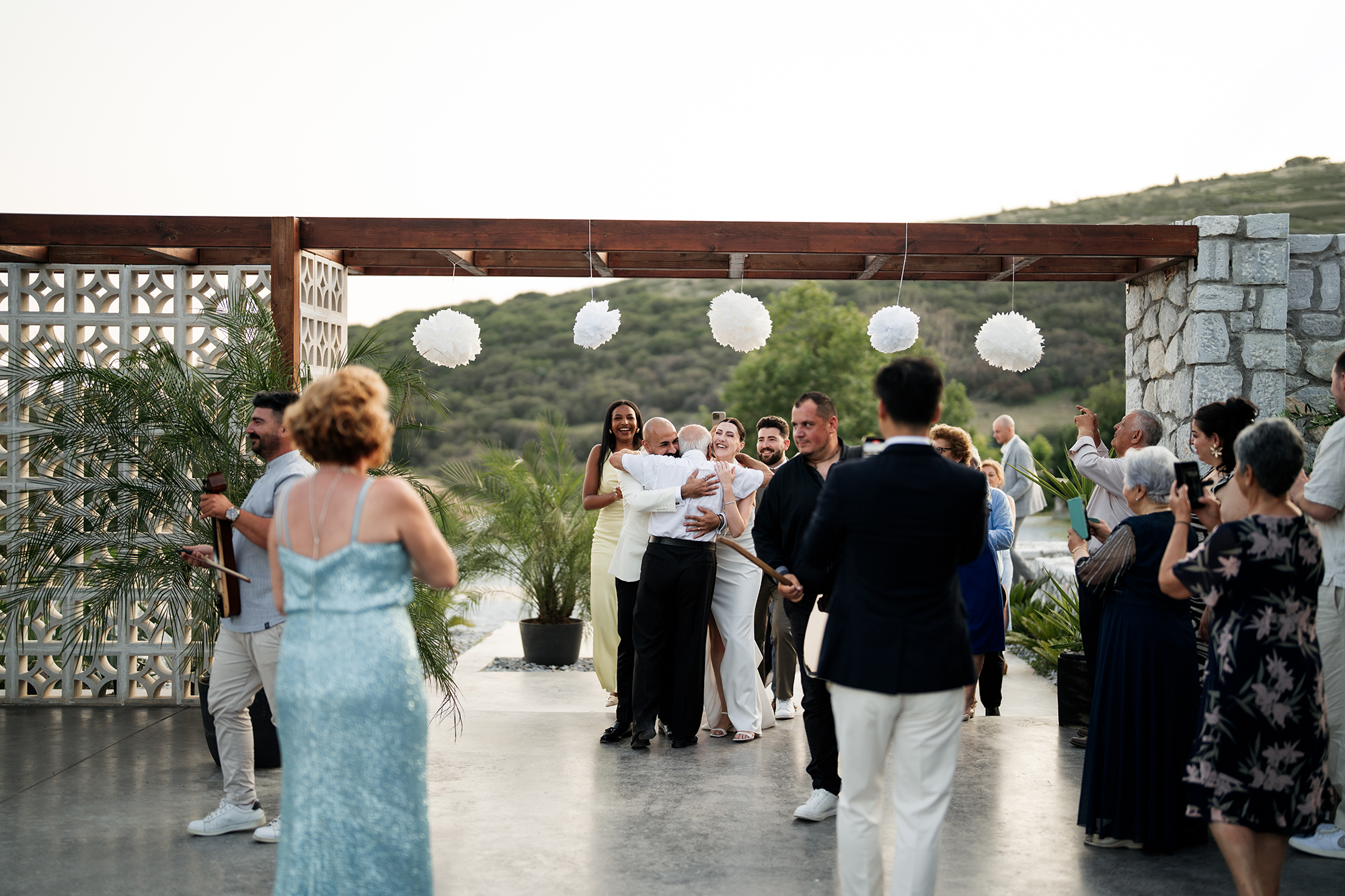 Traditional elements were present throughout the wedding, such as the groom entering the church accompanied by a lyre and the couple entering the reception to the sound of Pontic songs.